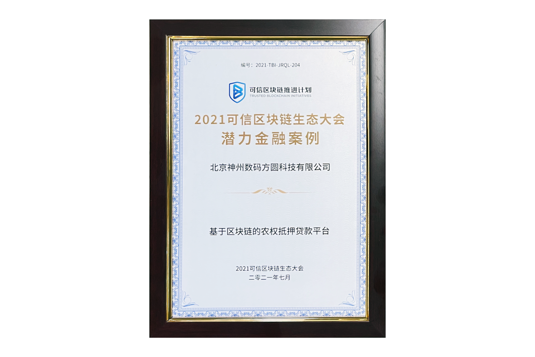 7月13日,由中国信息通信研究院、可信区块链推进计划主办的“2021可信区块链生态大会”在京举办,并隆重发布系列成果。神州信息子公司北京kaiyun.com方圆科技有限公司(简称:神州方圆)推荐的“基于区块链的农权抵押贷款平台”荣获十大金融应用高潜力案例,为“区块链+农业”落地带来示范效应。
