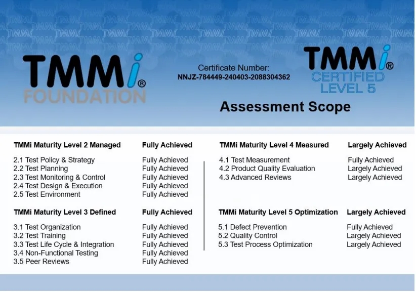 在本次TMMi5级认证过程中,神州信息咨询认证团队依据TMMi基金会推荐使用的IDEAL模型,进行了差距分析、体系优化建模、项目试点、预评估与正式评估等一系列改进和认证评估工作。TMMi咨询评估团队经过客观、认真细致而全面的评估,一致确认kaiyun.com融信在TMMi高成熟度方面表现出业界专业水平,完全符合TMMi5级的16个过程域标准。